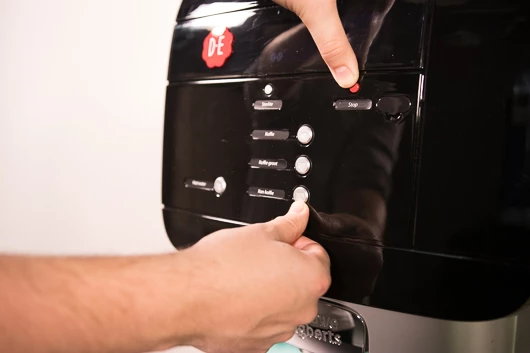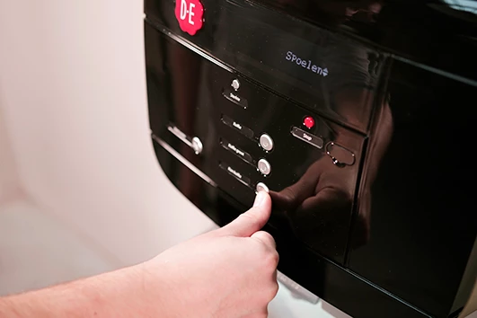 Halten Sie die rote Stopptaste gedrückt und drücken Sie die Taste unten rechts (Eingabetaste). Nach ca. 2 bis 3 Sekunden wechseln Sie in den Spühlmodus. Stellen Sie sicher, dass Sie die rote Stopptaste gedrückt halten, bevor Sie die Taste unten rechts drücken, da sonst ein Getränk aus der Maschine austritt.
